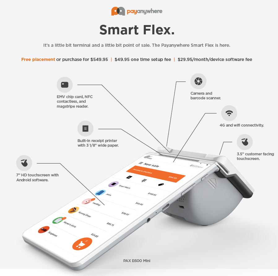 The Payanywhere Smart Flex is the ideal solution for merchants who want the flexibility to accept payments anywhere in their stores and enhance their customer payment experience.