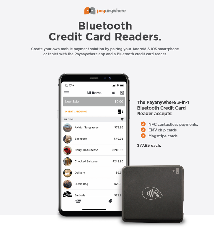 Payanywere 3-in-1 Bluetooth Card Reader that also accepts NFC Payments like Apple Pay available free with new account.
