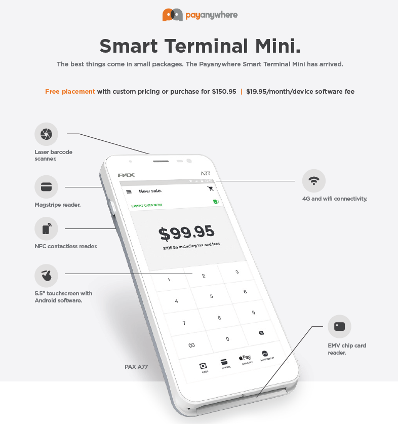 The Payanywhere Smart Terminal Mini is the ideal solution for business owners who want mobility, super speedy transactions, and a completely green payment experience.